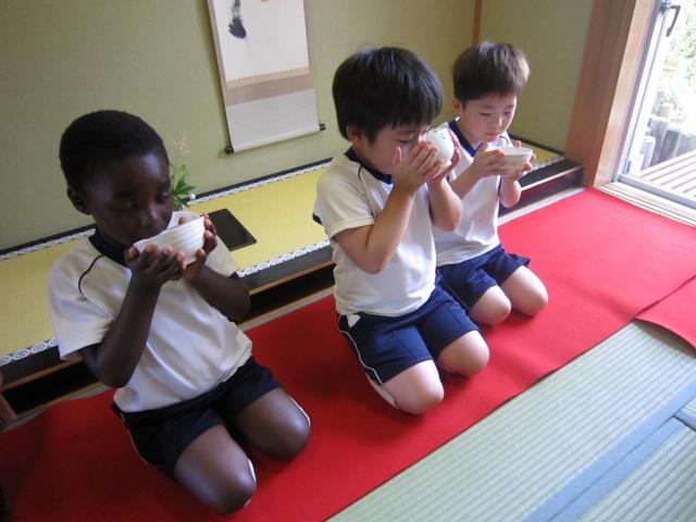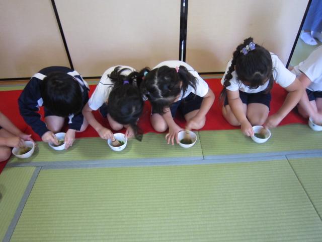 年長さんになって初めての理事長先生が教えて下さるお作法の会がありました🍵 年中さんの時は自分が飲むお茶を点てたんですが、 年長になるとお友だちのためにお茶を点てて渡したんですよ✨ 長い時間正座をしてたので足しびれなかったかな